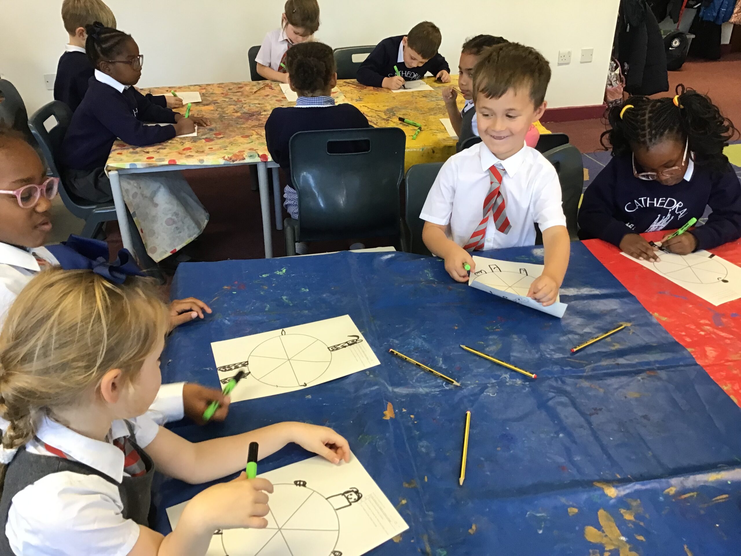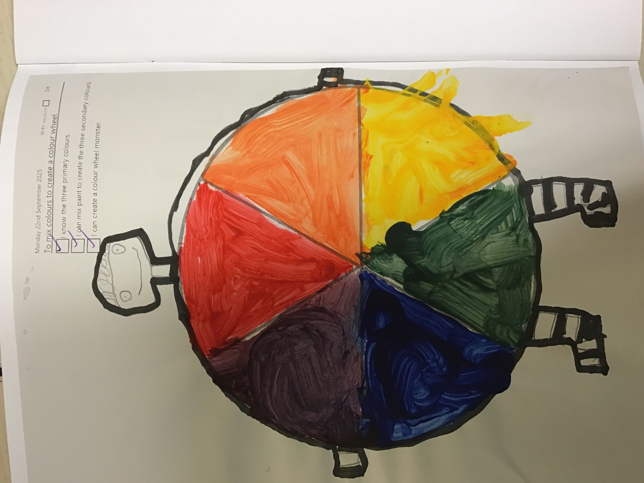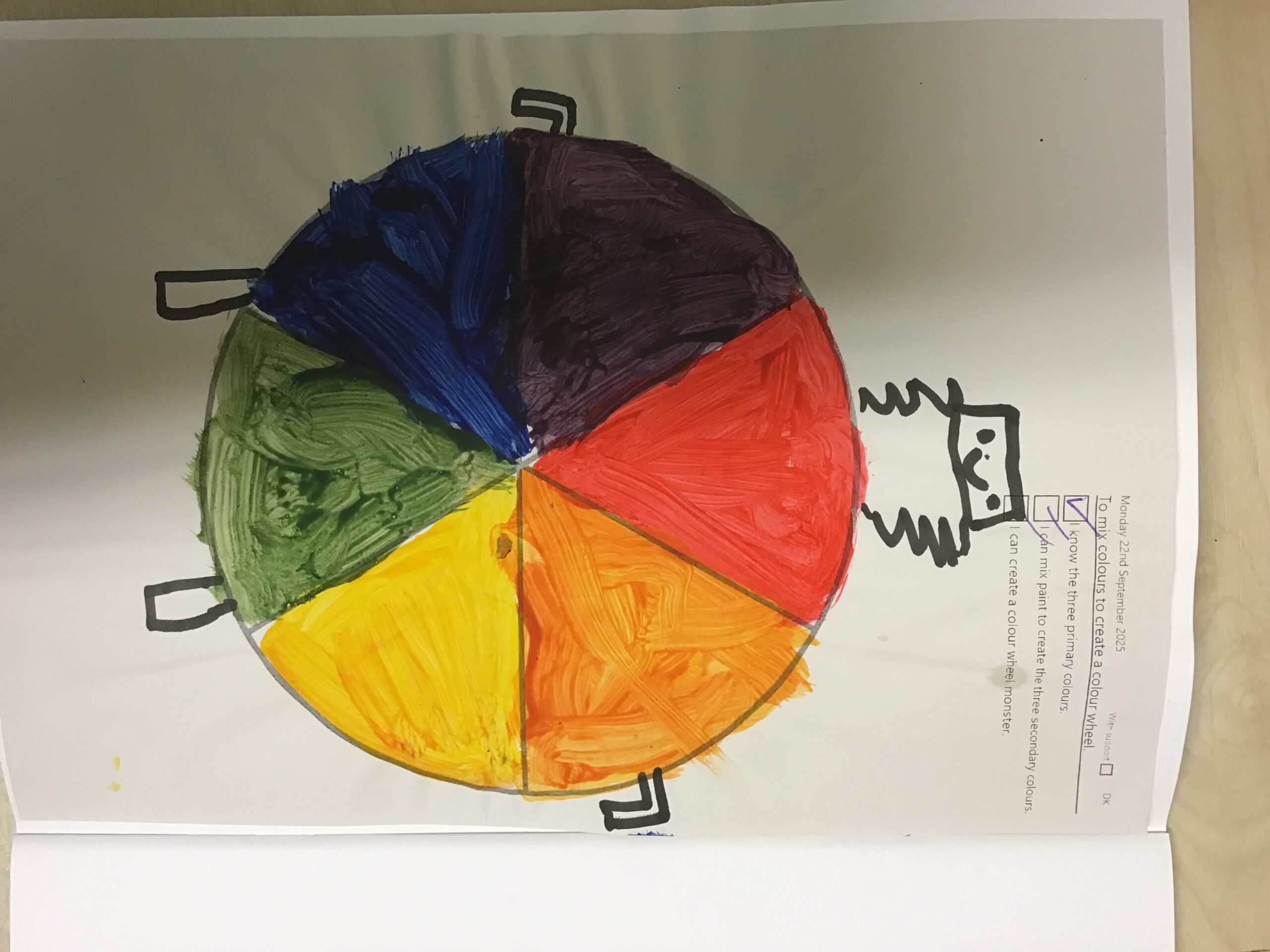 Inspired by this, we created our very own colour wheel monsters! The children experimented with mixing the primary colours (red, blue, and yellow) and were delighted to see new colours appear. Together, they successfully made purple, green, and orange, which they used to bring their monsters to life.