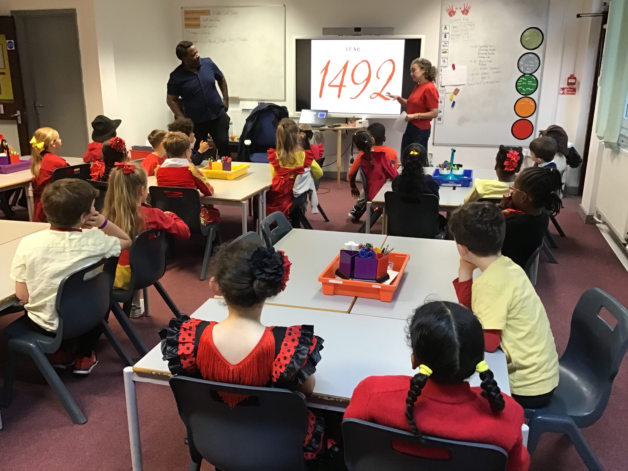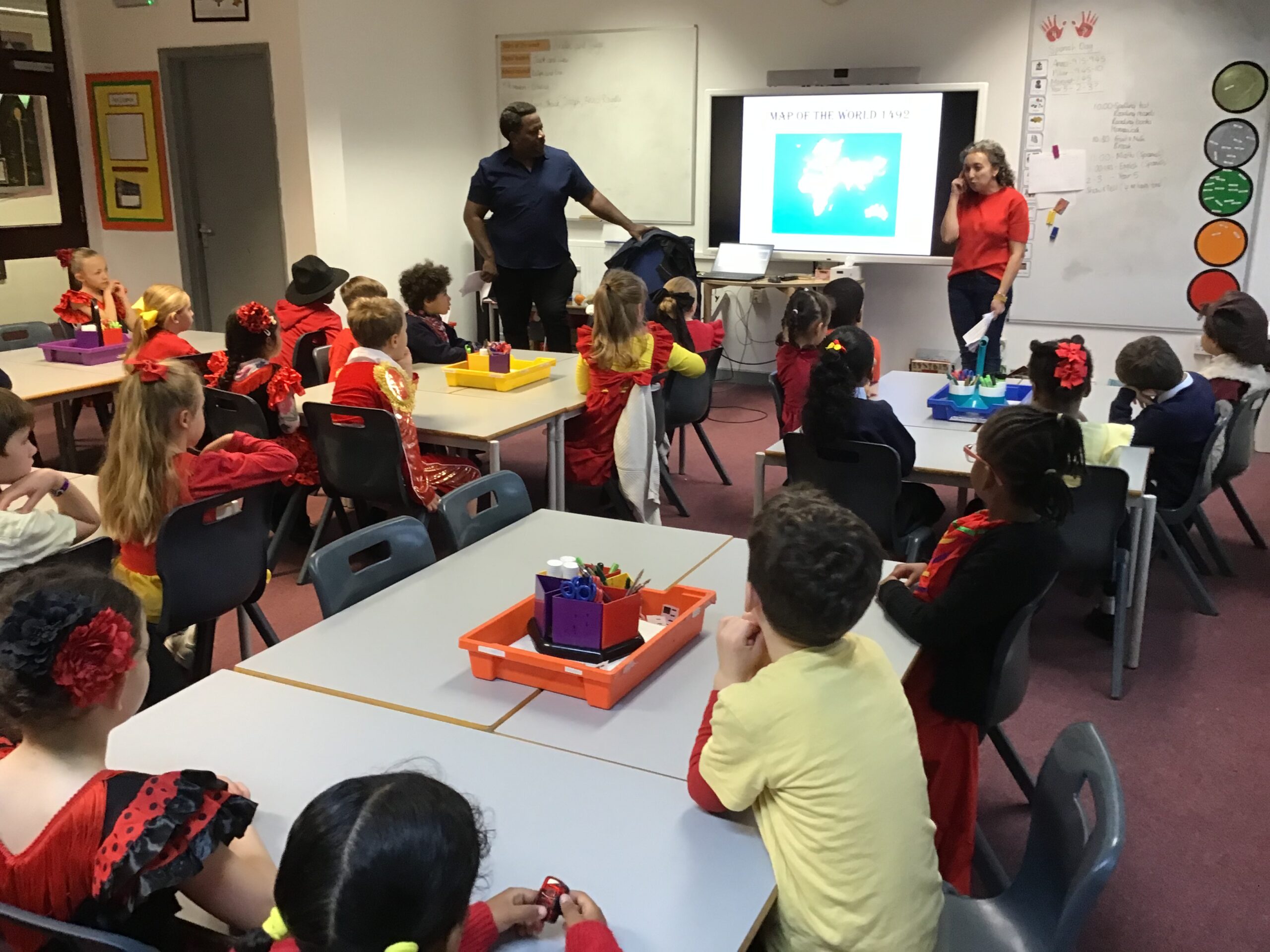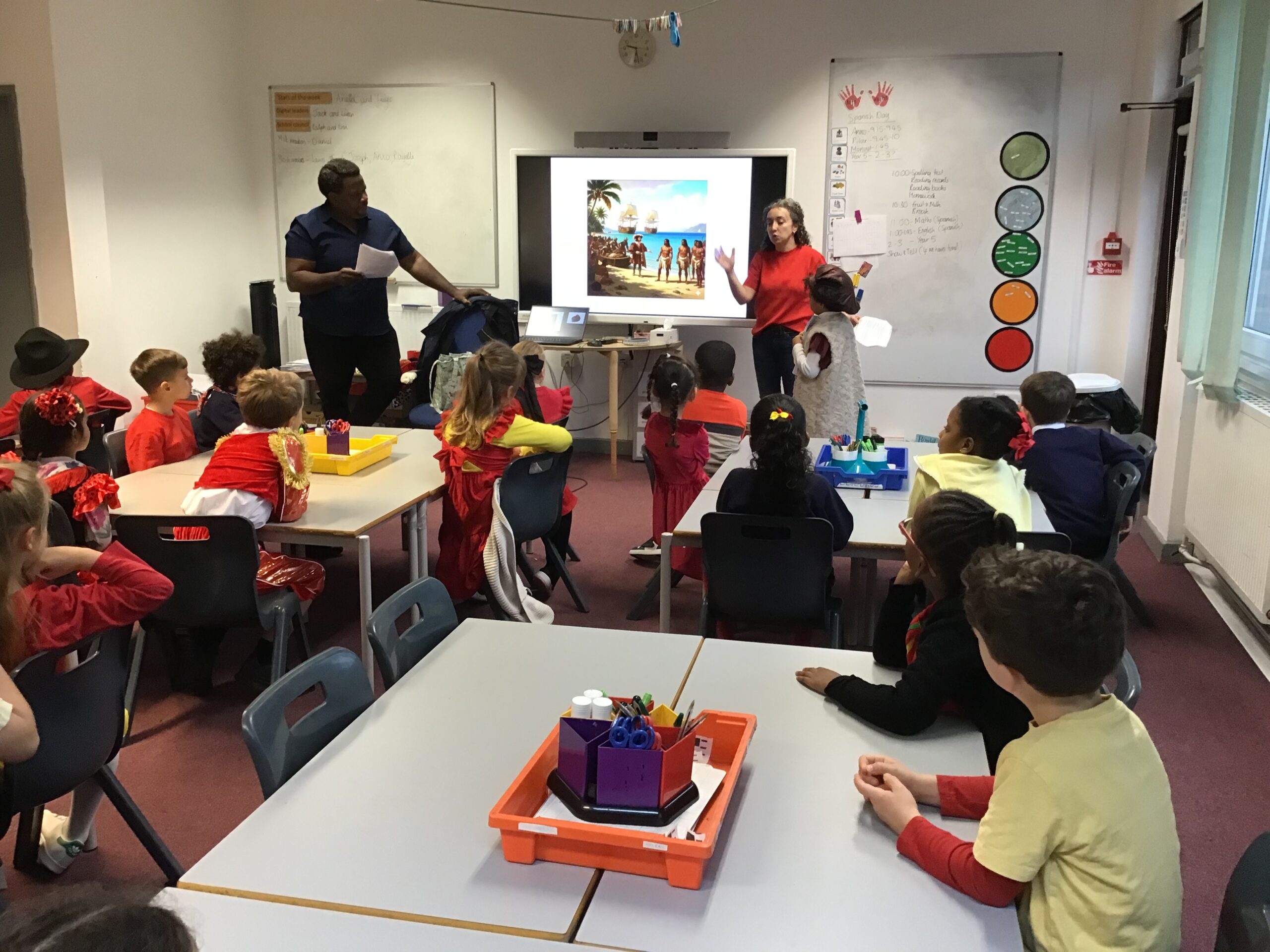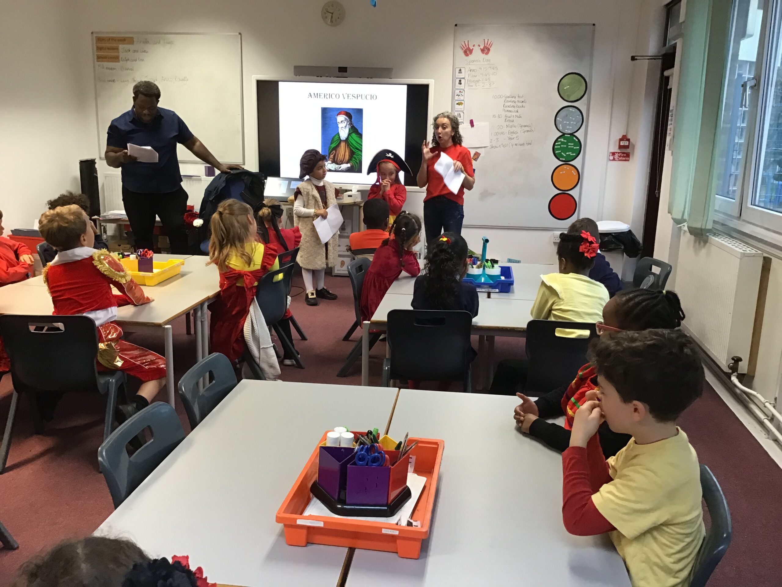 Year 2 had a fantastic time celebrating Spanish day last Friday! We started off the day by learning about Christopher Columbus and Amerigo Vespucci. Thank you to Patrica, Ubaldo and Anxo for the exciting reenactment! We then had a visit from Pilar where she showed us some traditional Spanish clothing and let us play with her musical instruments. We also did our Maths and English in Spanish just before having a tasty Spanish feast! In the afternoon we shared our learning with Year 1 and Year 5. What a fun Spanish day – we are already looking forward to next year!