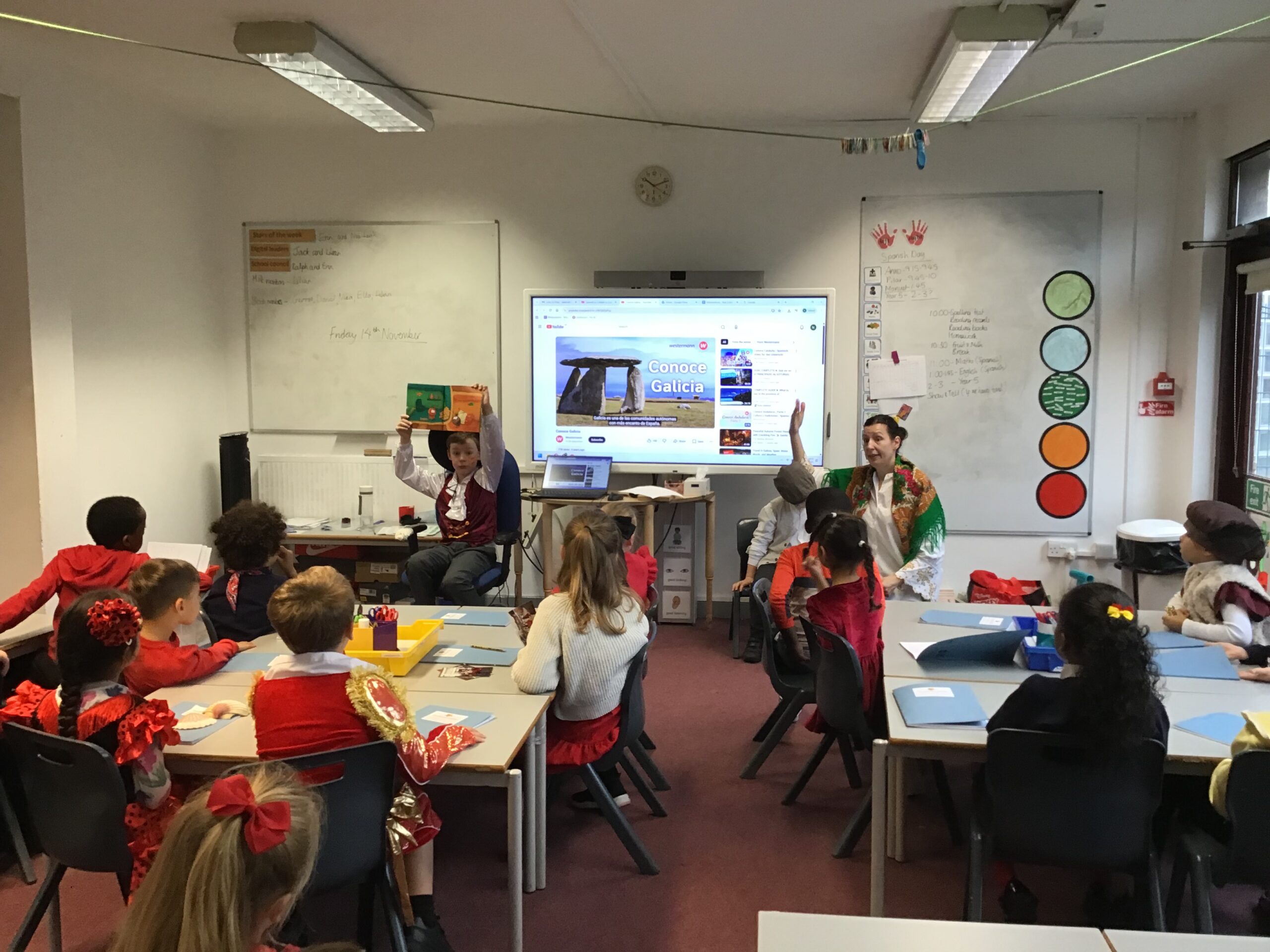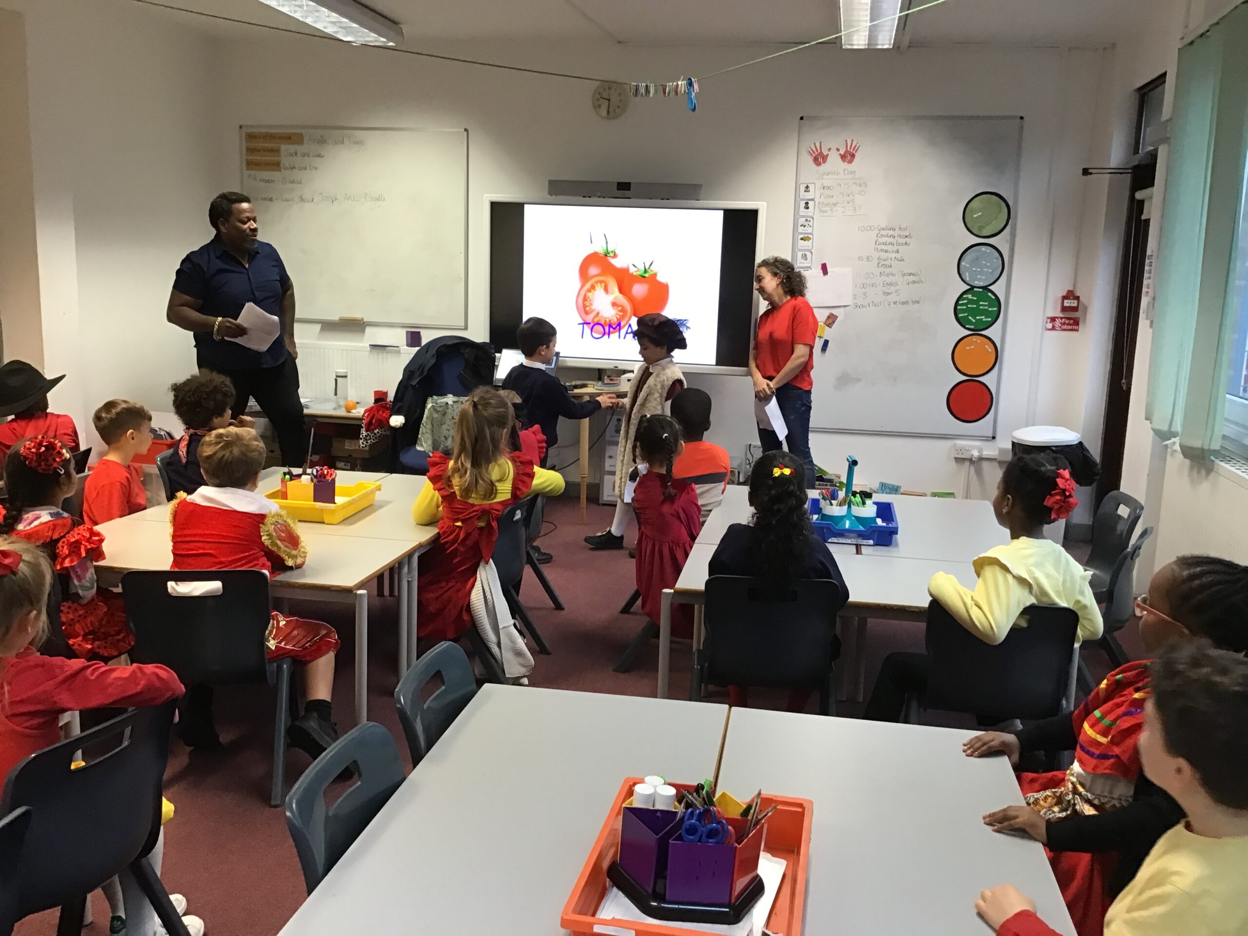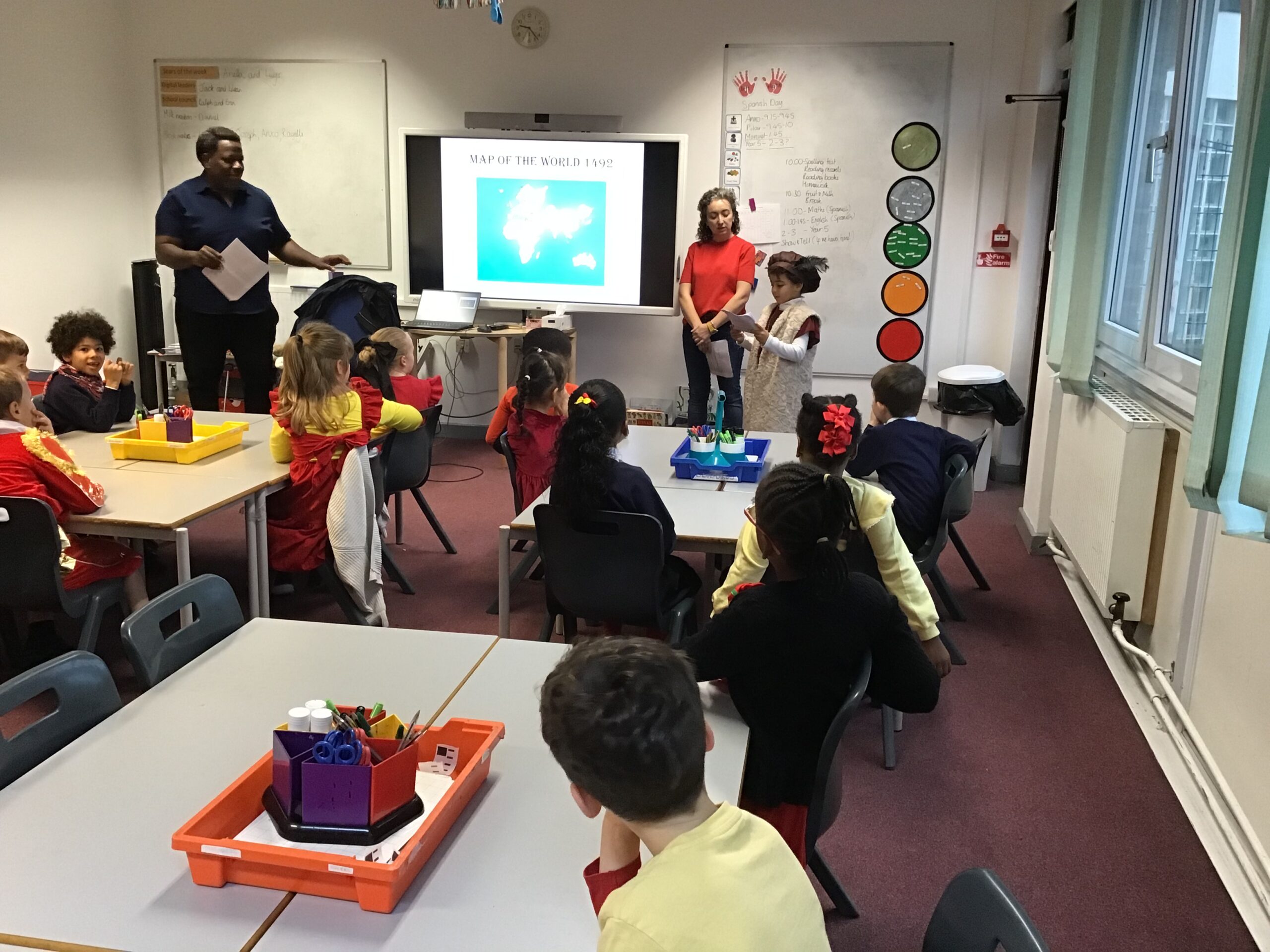 Year 2 had a fantastic time celebrating Spanish day last Friday! We started off the day by learning about Christopher Columbus and Amerigo Vespucci. Thank you to Patrica, Ubaldo and Anxo for the exciting reenactment! We then had a visit from Pilar where she showed us some traditional Spanish clothing and let us play with her musical instruments. We also did our Maths and English in Spanish just before having a tasty Spanish feast! In the afternoon we shared our learning with Year 1 and Year 5. What a fun Spanish day – we are already looking forward to next year!