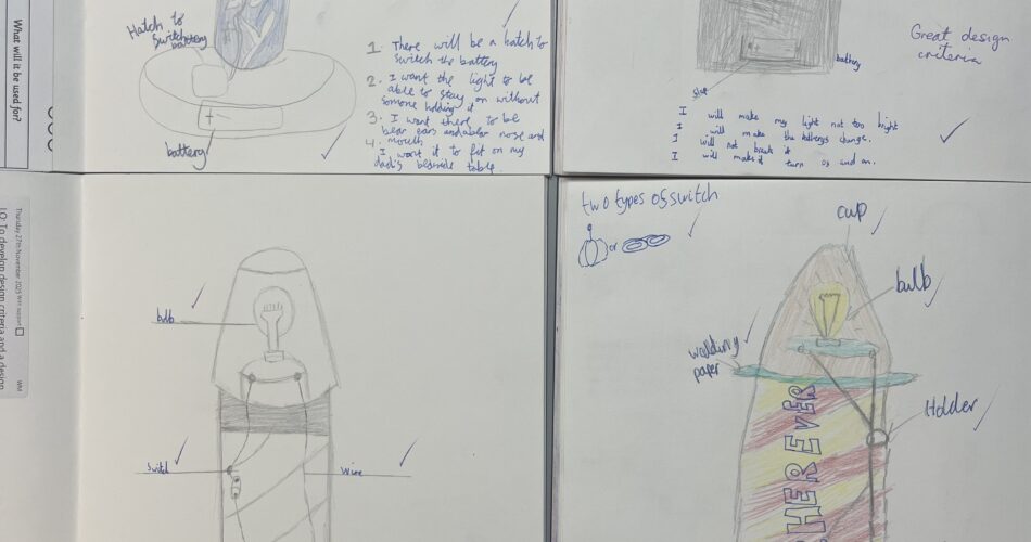 In class 4, they have produced brilliant designs for their DT projects – battery operated lights. The children made design criteria before making their products, thinking about the size, brightness, purpose of their item and who they will be creating their item for.