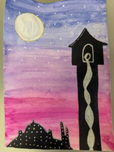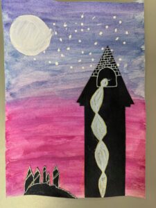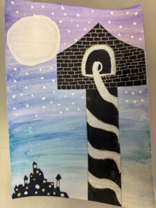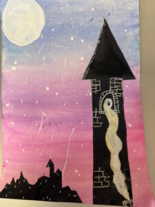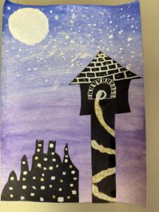 This week, we have been busy finishing off our amazing Rapunzel display work. First, we blended watercolours to create the sky. Then, we created a silhouette of the tower. Finally, we added the detail using chalk markers and paint pens. These will be soon be proudly displayed in the KS1 corridor as part of our Book Week theme of the Grimm Tales.