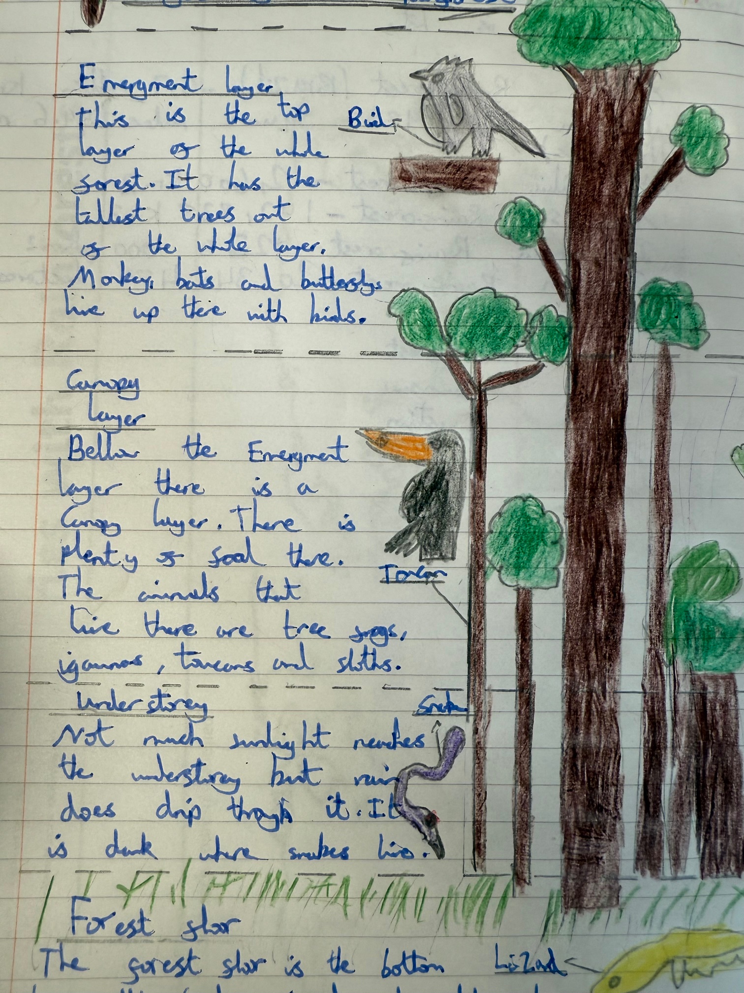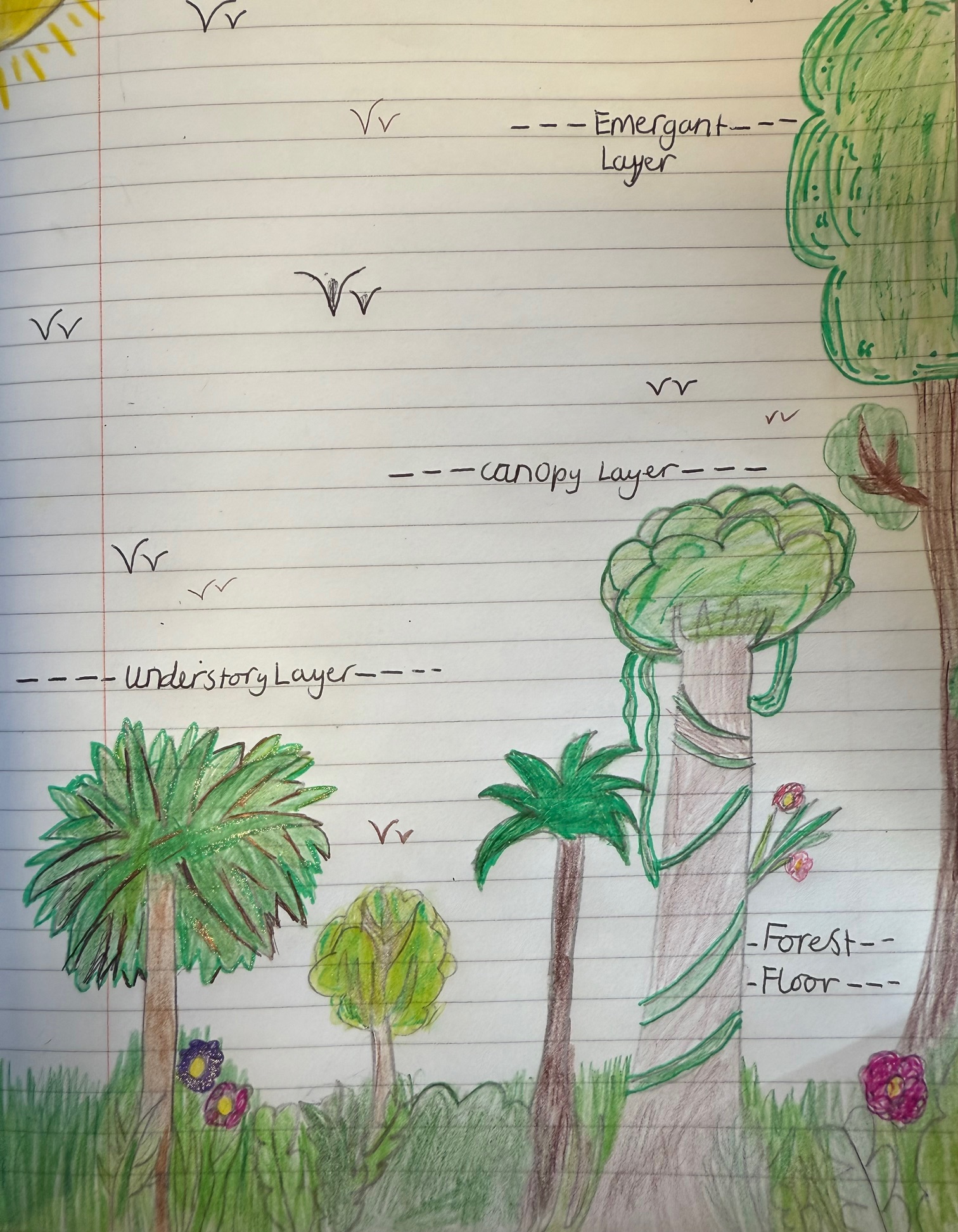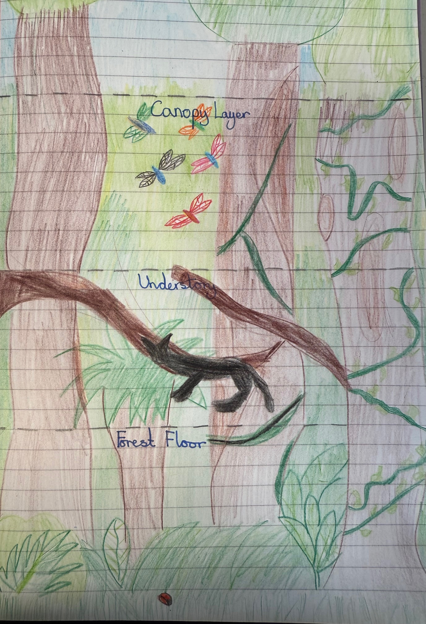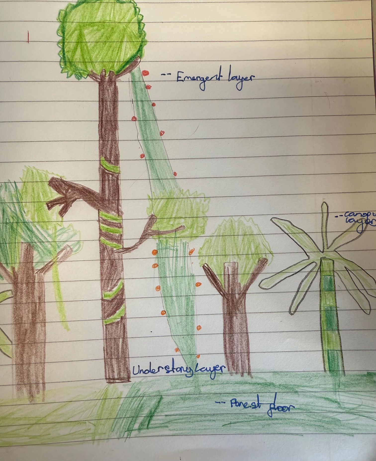 This week, we have been learning about the different layers of the rainforest: the emergent layer, the canopy, the understory and the forest floor. We learnt about how each layer is different and some examples of different animals living in each layer.