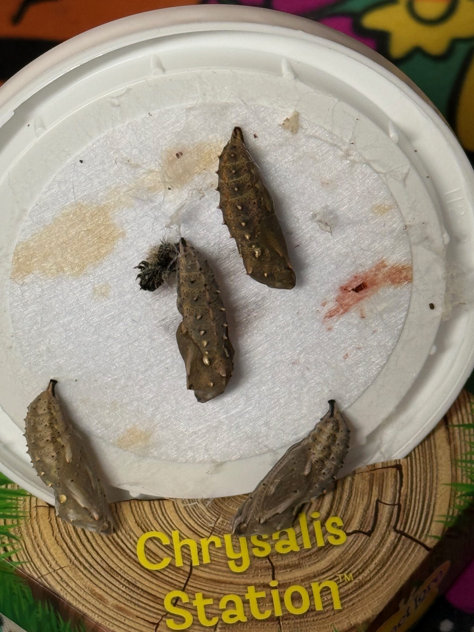 Additionally, our caterpillars have now moved into the next stage of their life cycle – a chrysalis. We look forward to seeing them turn into butterflies!