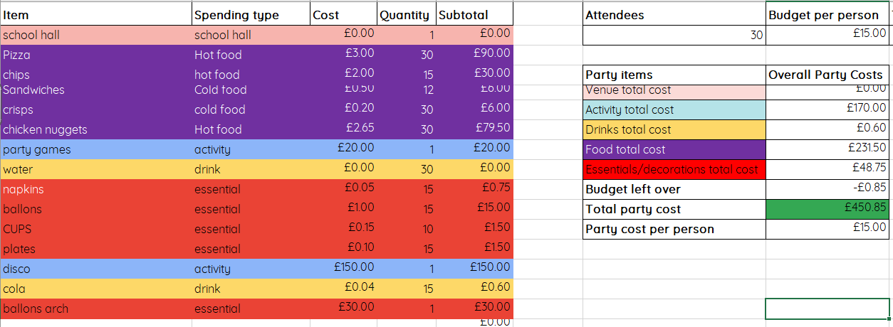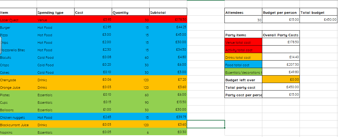 In Computing this week, Class 6 have been organising some parties! They were given a specific budget and had to calculate the totals of each item using simple calculations. Using the 4 different operations and colour coding each item, it was interesting to see how different each decision was between the partners!