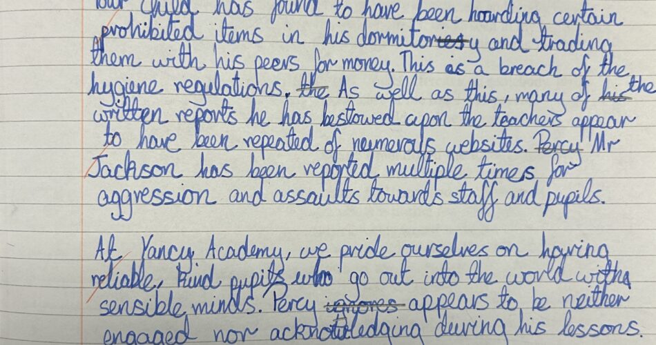 This week in Class 6 we have been looking at formal and informal register. We continued reading the next chapter in our class text and read up to the part where Percy Jackson is about to be expelled from his school. Following this, we planned out two very different messages: one of them was the very formal letter from his headmaster, and the other was an informal text to one of his closest friends Grover. The children adjusted the formality of each message brilliantly, with some contractions in the informal text and some longer complex sentences in the formal letter.