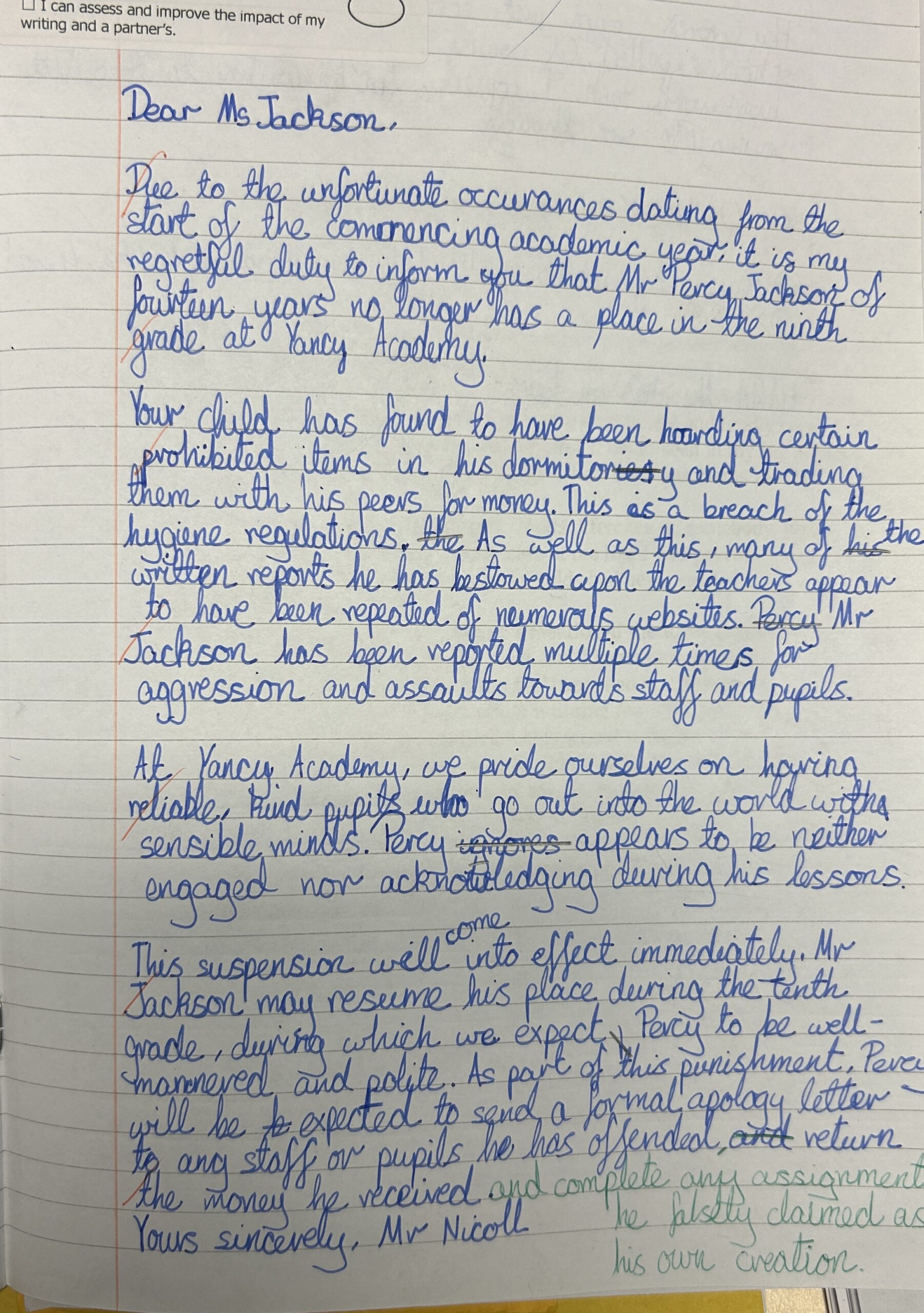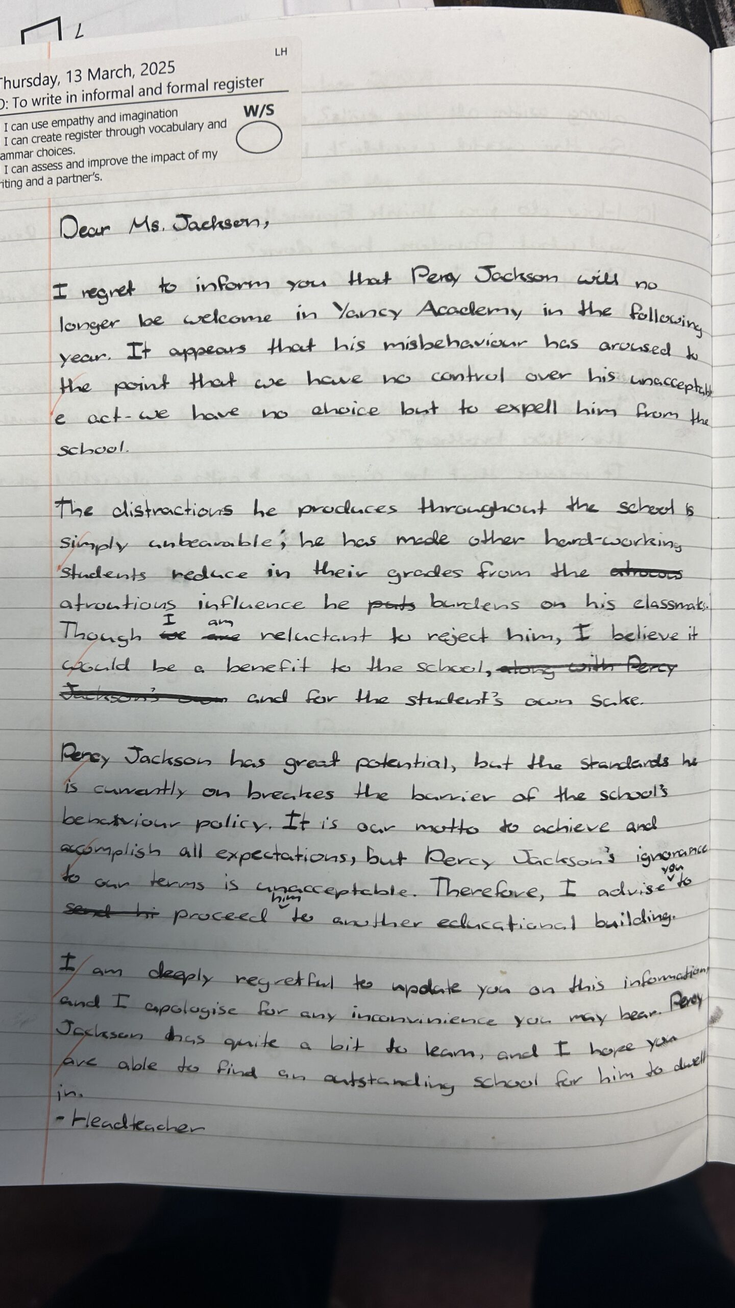 This week in Class 6 we have been looking at formal and informal register. We continued reading the next chapter in our class text and read up to the part where Percy Jackson is about to be expelled from his school. Following this, we planned out two very different messages: one of them was the very formal letter from his headmaster, and the other was an informal text to one of his closest friends Grover. The children adjusted the formality of each message brilliantly, with some contractions in the informal text and some longer complex sentences in the formal letter.