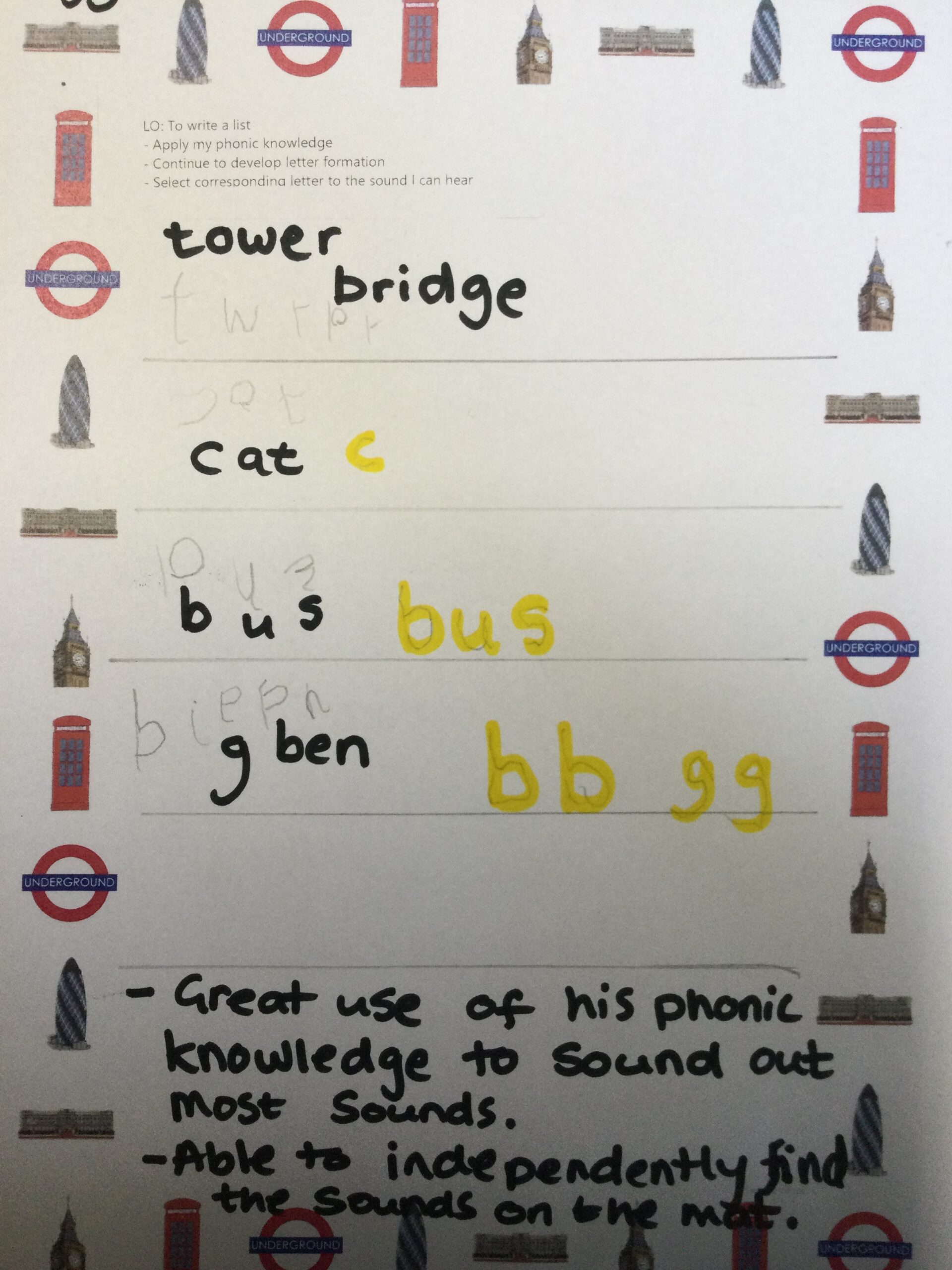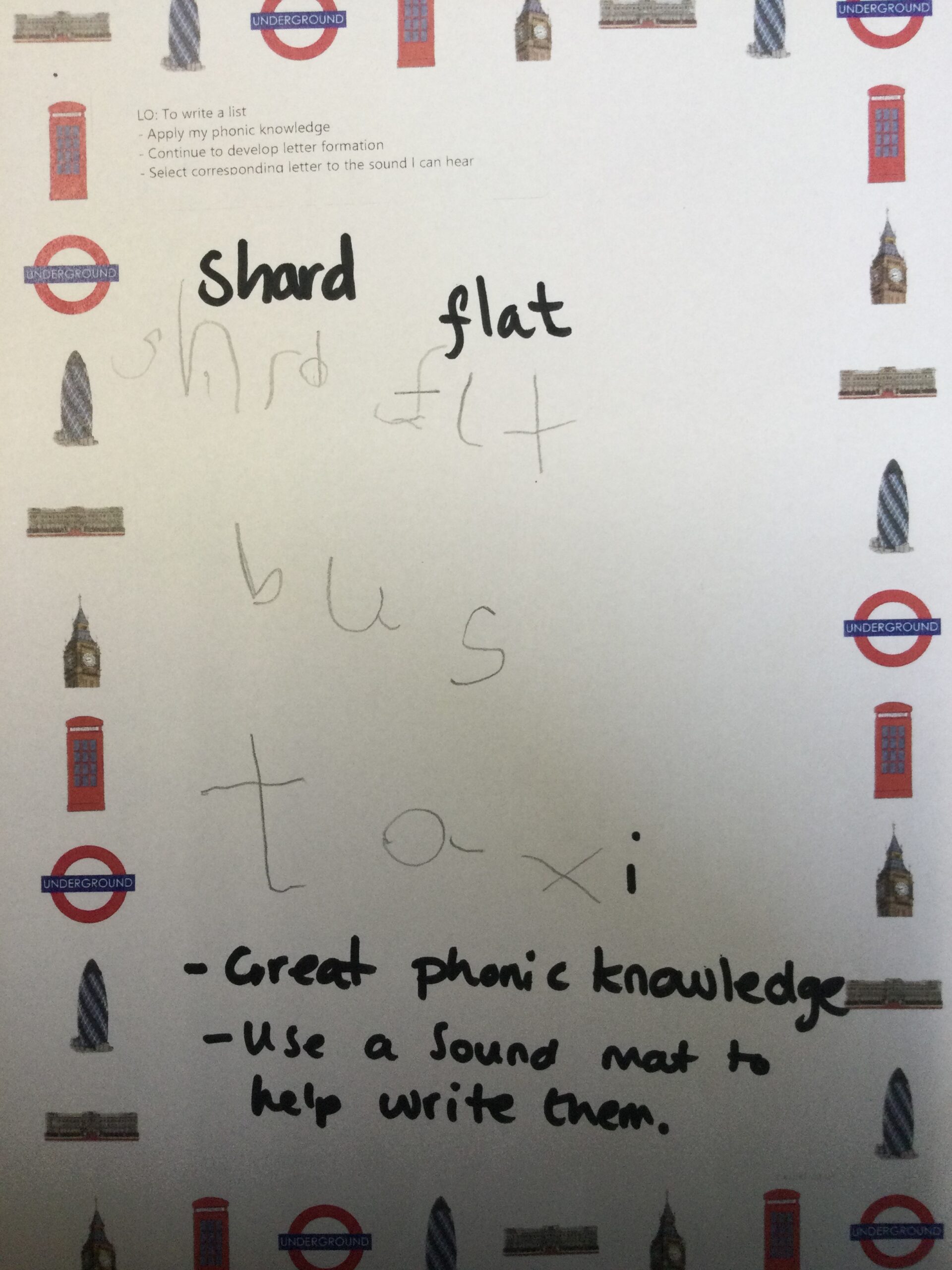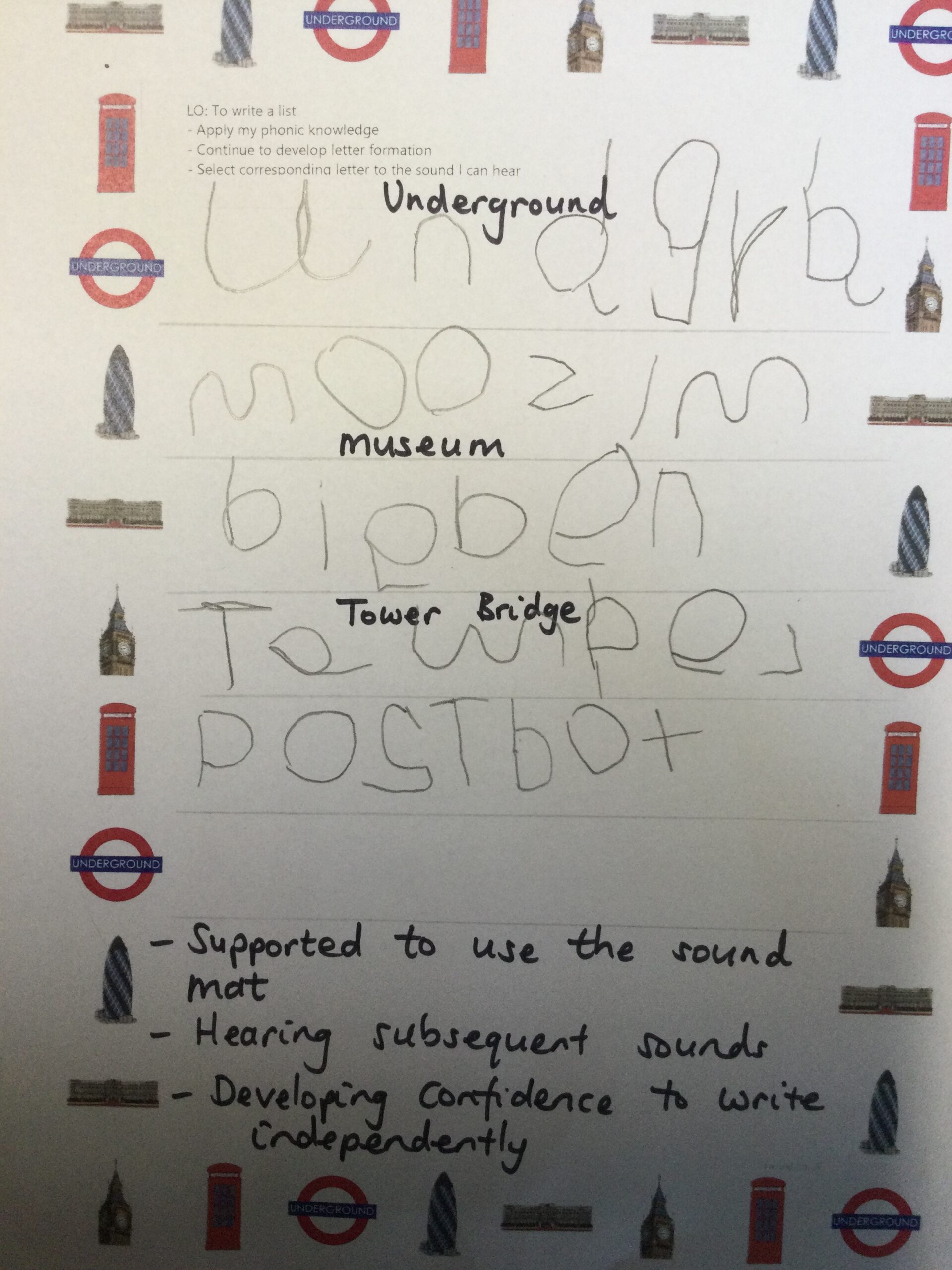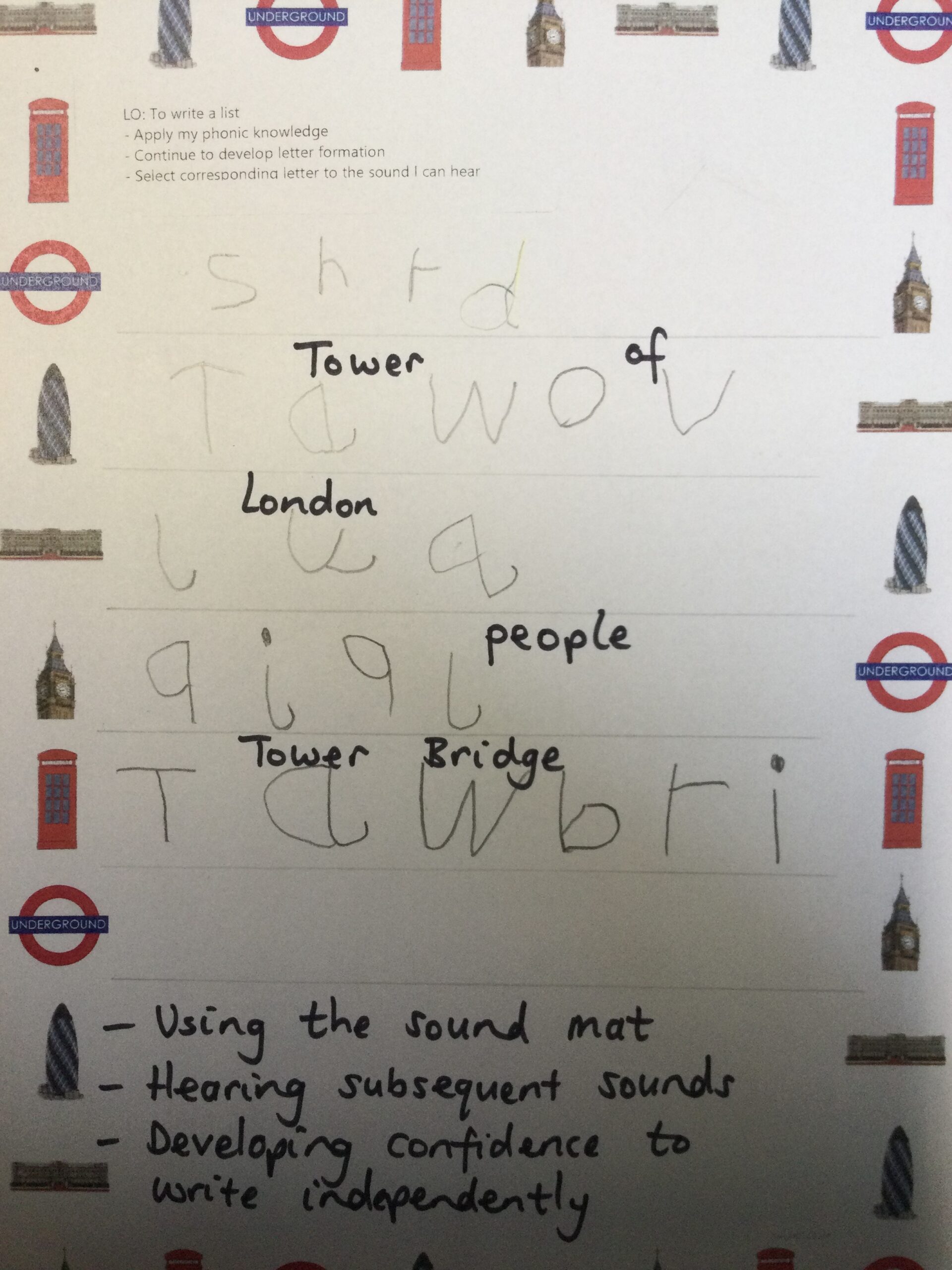 Well done to Caleb and Oli who write lists of things we find in London, independently applying their phonic knowledge, and working hard on their letter formation!